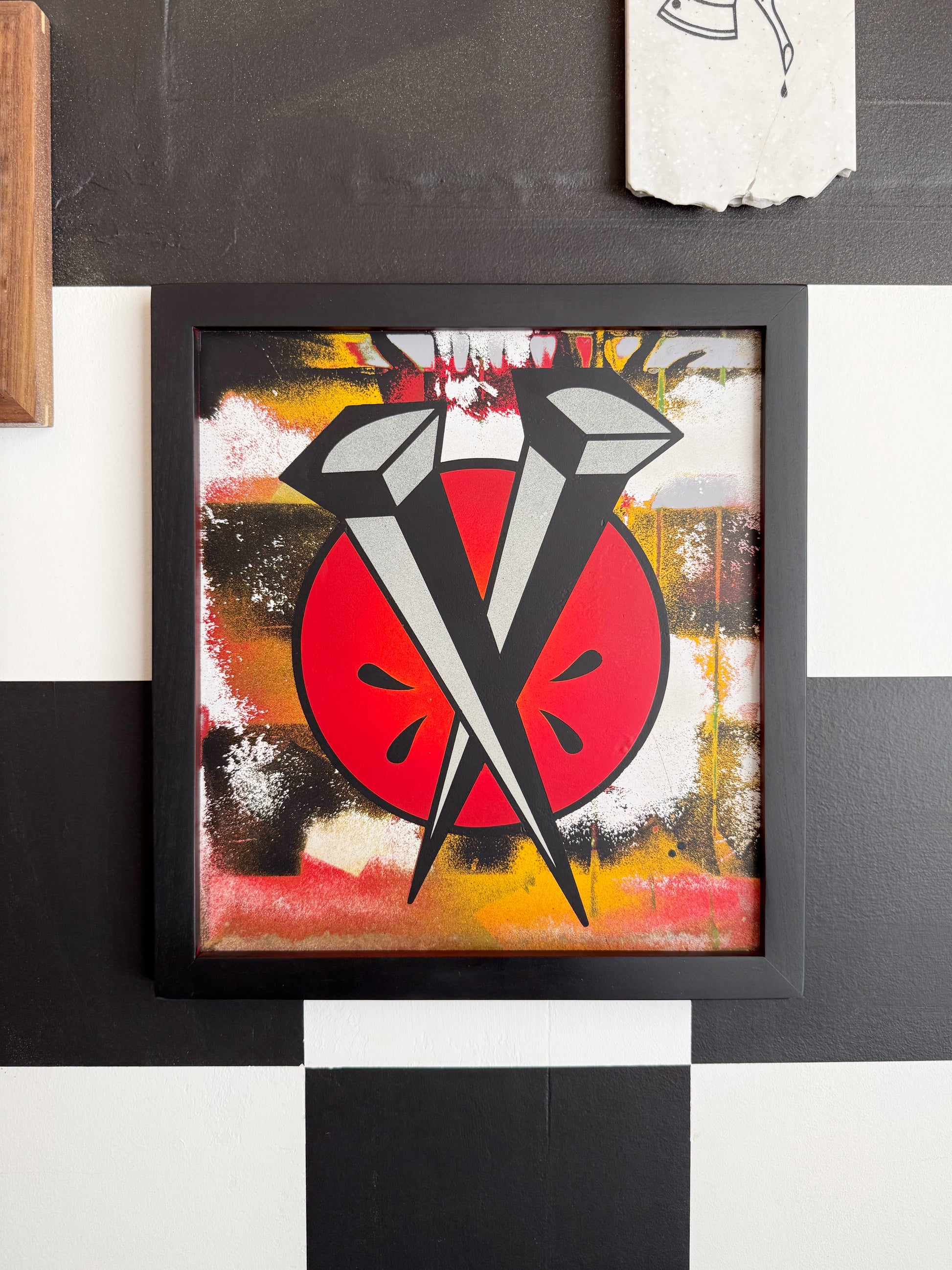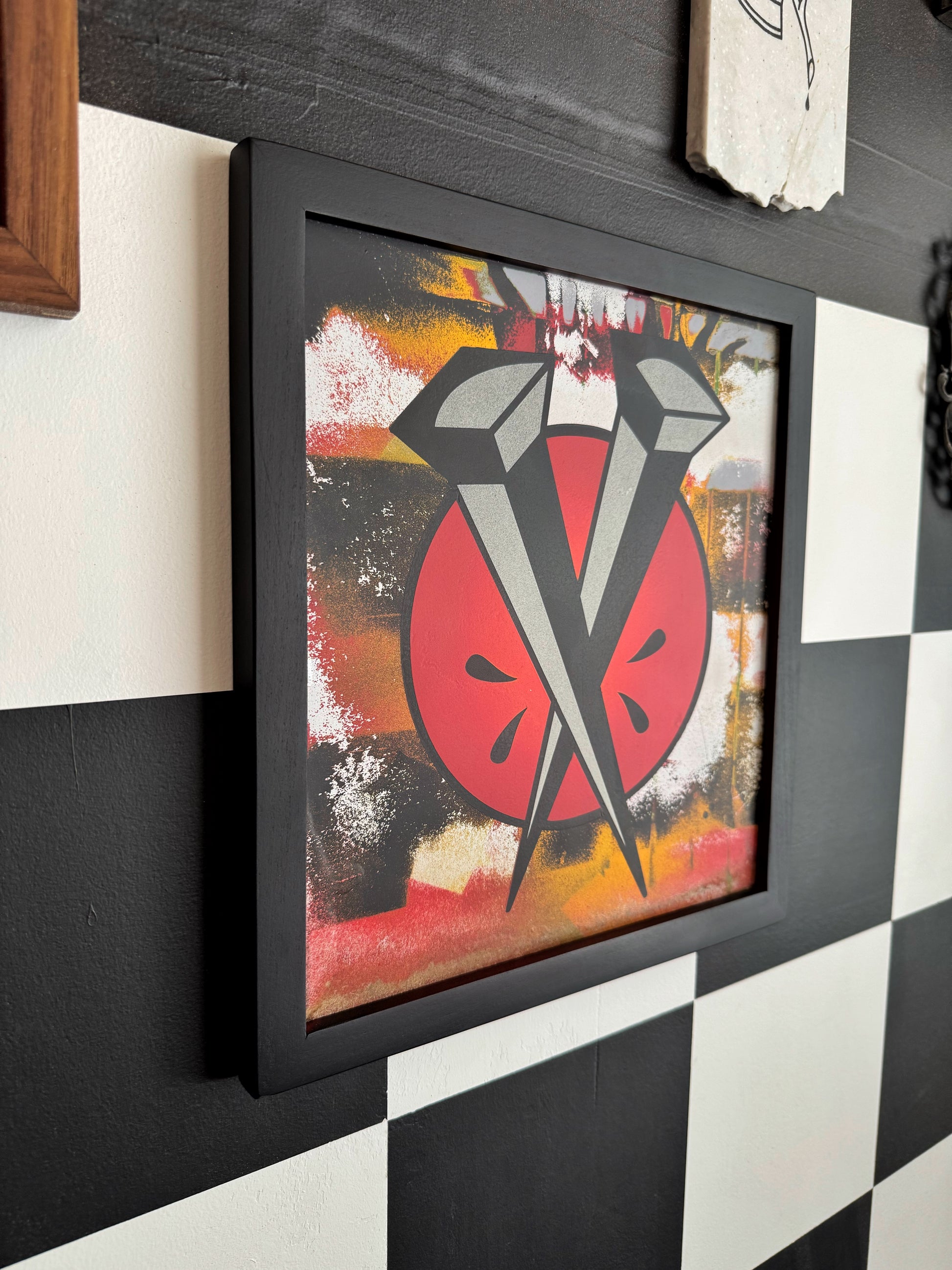 This piece measures 11.25”w by 12.25”t, ready to hang on a drywall screw or a nail.